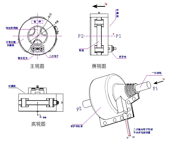极性同名端 封灌面“P1”与接线端子“S1”为同名端极性关系(减极性)